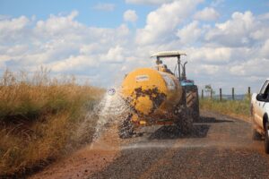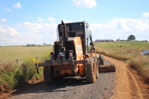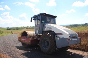 Foram executados os serviços de alargamento da via, colocação de tubulações e valetamento, e atualmente está sendo aplicada uma camada de brita nº1, que será compactada para garantir mais firmeza e durabilidade.